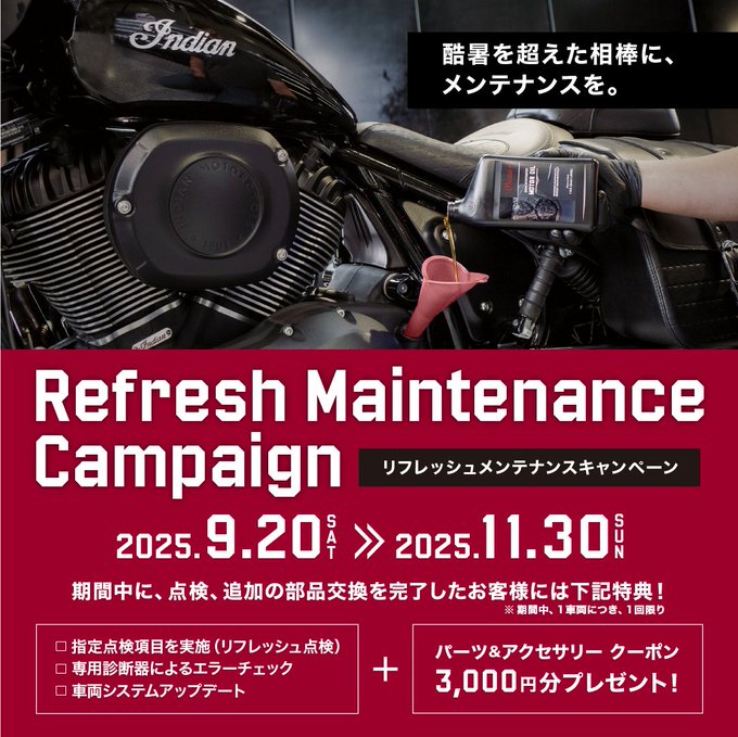 この夏(酷暑)をともに過ごした相棒にリフレッシュを・・・・!という訳で、ご入庫→無料点検→3,000円分のパーツ&アクセサリークーポンGET!!